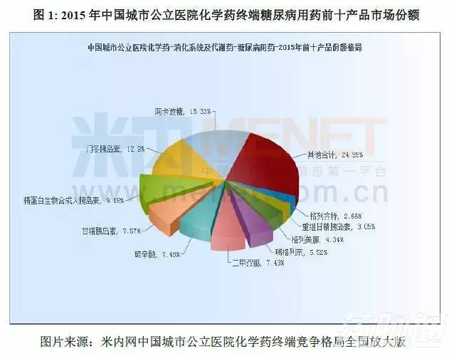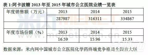 從圖1可以看出,阿卡波糖在2015年中國(guó)城市公立醫(yī)院化學(xué)藥糖尿病用藥的市場(chǎng)份額是15.33%。結(jié)合表1可知阿卡波糖在城市公立醫(yī)院中的年度銷售額逐年增長(zhǎng),2015年的銷售額達(dá)到334867萬(wàn)元。借助進(jìn)入2012版基藥目錄的契機(jī),阿卡波糖將實(shí)現(xiàn)放量增長(zhǎng),仍有較大的成長(zhǎng)空間。