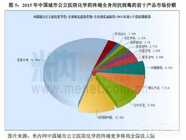 由表5可知恩替卡韋在2013年至2015年城市公立醫(yī)院化學(xué)藥全身用抗病毒藥中的年度銷售額和市場(chǎng)份額均呈現(xiàn)增長(zhǎng)的趨勢(shì),2015年的銷售額達(dá)523045萬(wàn)元,市場(chǎng)份額占到50.95%,結(jié)合圖5可以看出恩替卡韋在全身用抗病毒藥中的絕對(duì)領(lǐng)先地位。